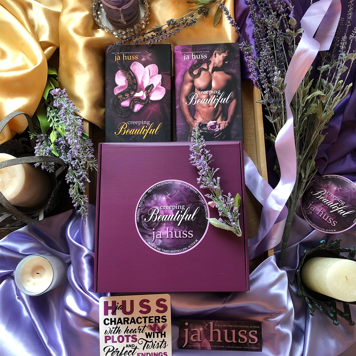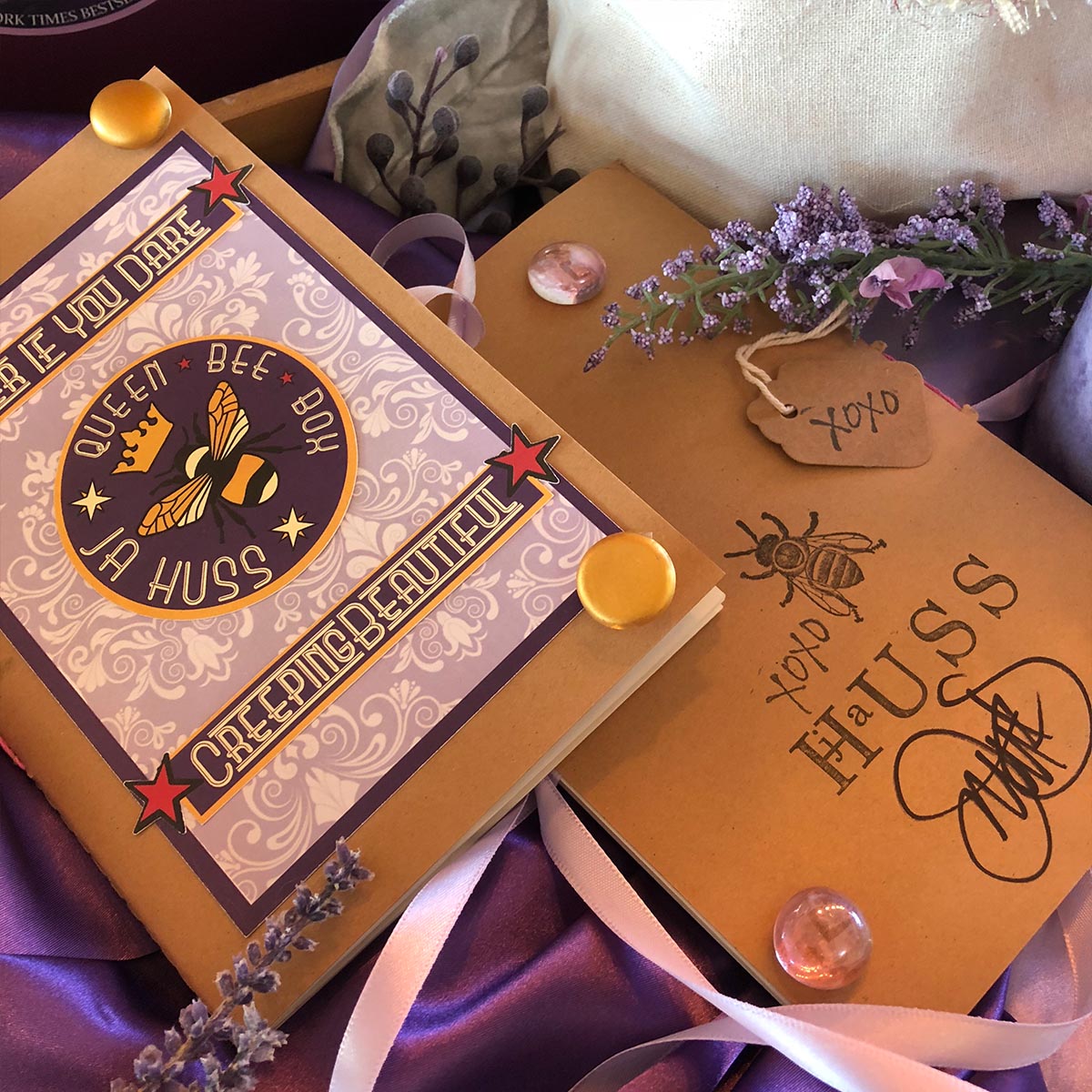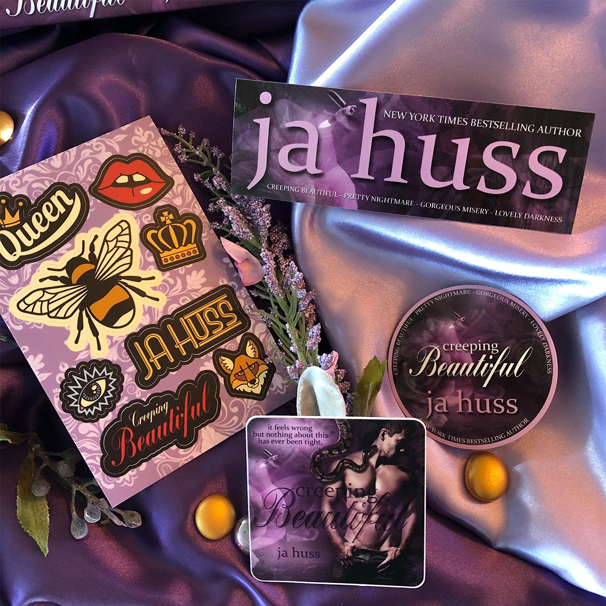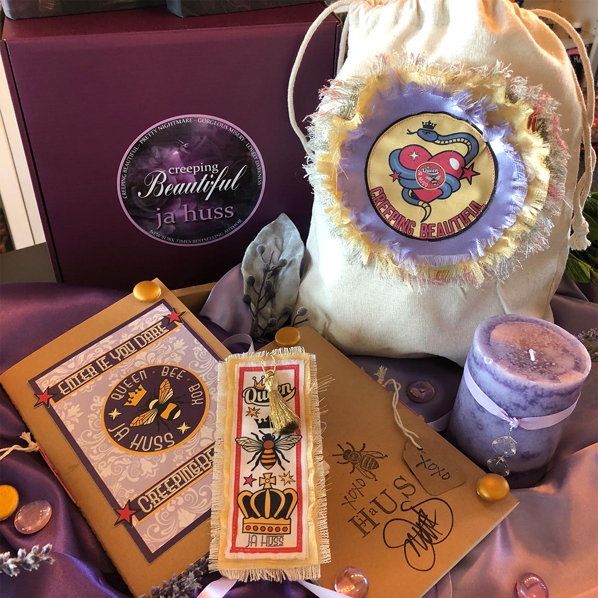 The maiden-voyage Queen Bee Box has been specially designed around the JA Huss February release, Creeping Beautiful. It contains fifteen items, all of which are based on custom designs and can be seen in detail below. Two special dust-jacket hardcovers are included. The original cover design and the special edition cover design.