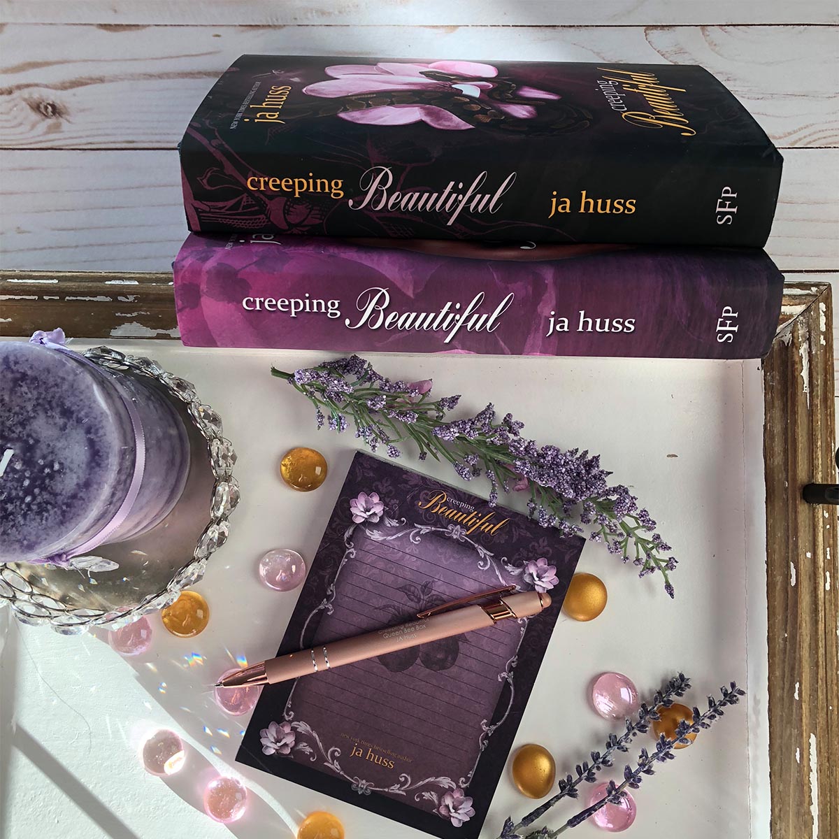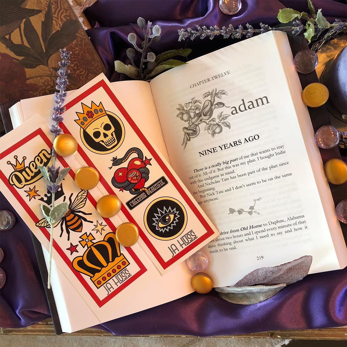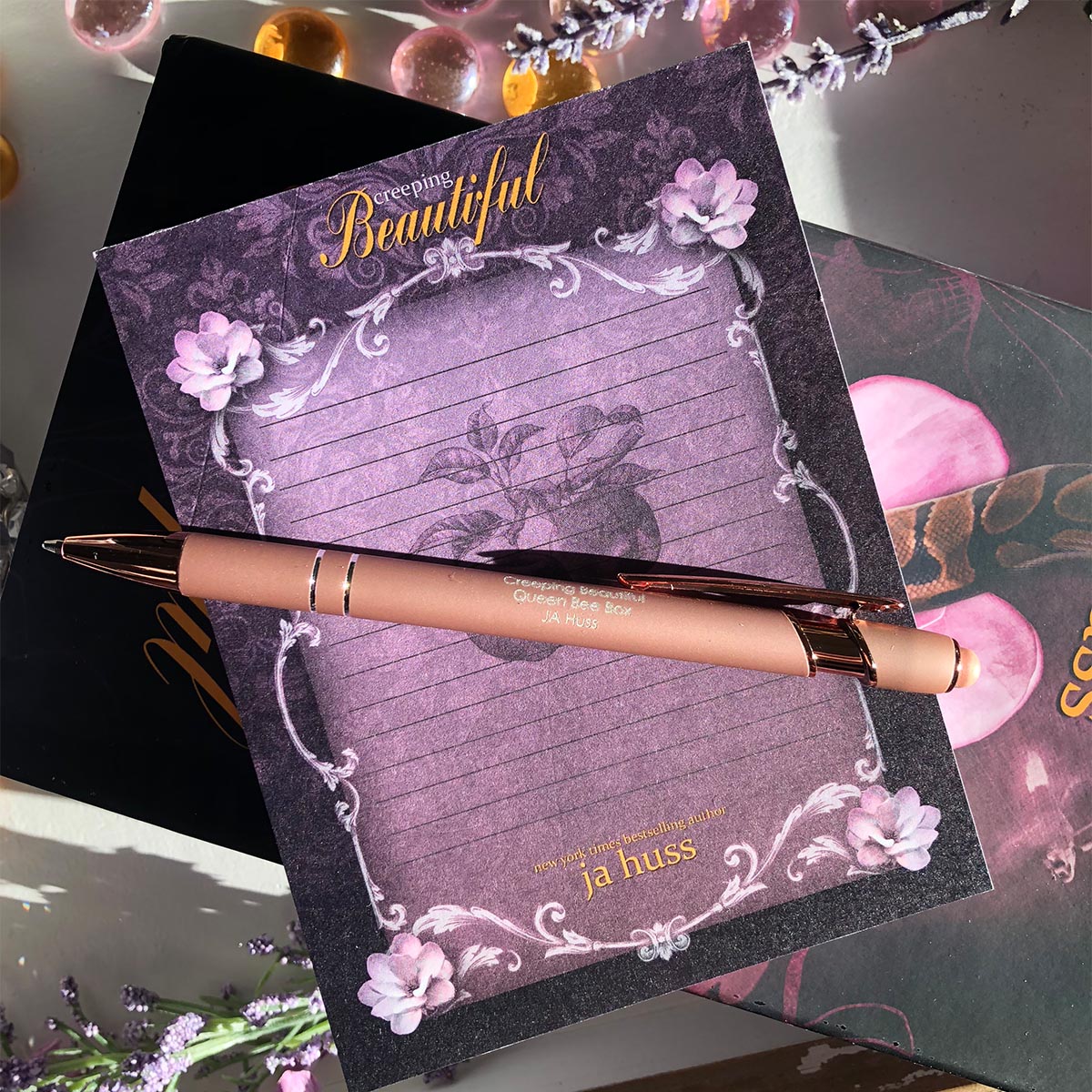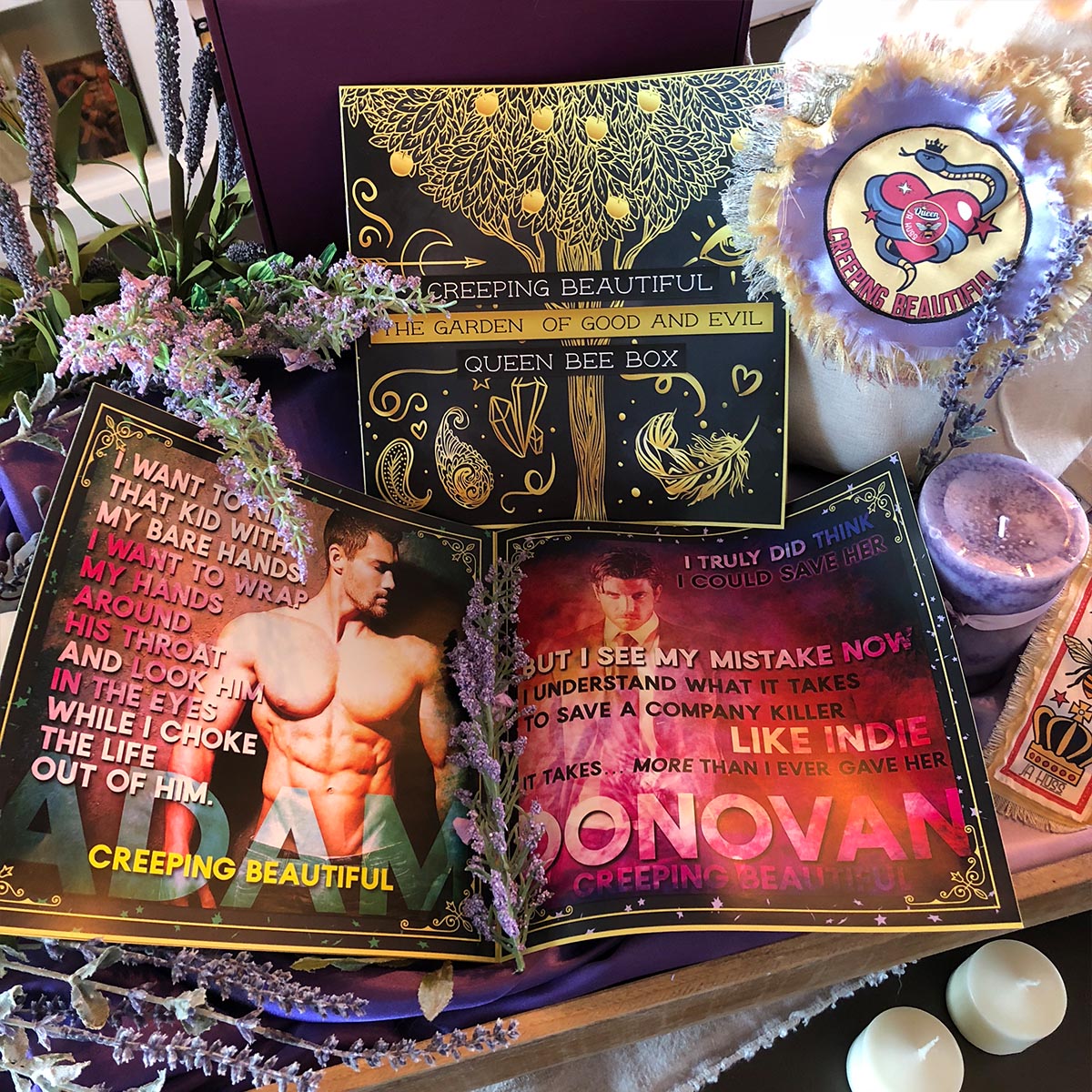 The maiden-voyage Queen Bee Box has been specially designed around the JA Huss February release, Creeping Beautiful. It contains fifteen items, all of which are based on custom designs and can be seen in detail below. Two special dust-jacket hardcovers are included. The original cover design and the special edition cover design.
