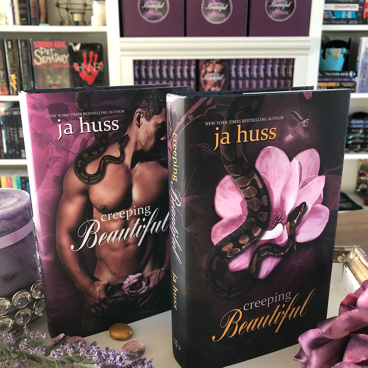 Each box has a theme built around the TWO special edition JA Huss hardcover books. Typically one book will be a new release and one book will be a brand new signed-and-numbered limited-edition of an older work but the first box offered has two different editions of Creeping Beautiful. Both books have a dust-jacket hard cover.